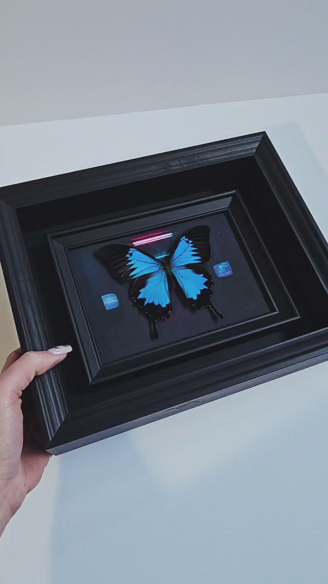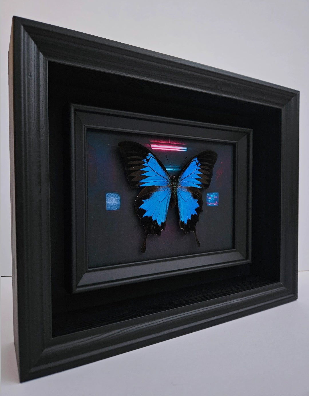 Gallery-style Papilio Ulysses in a deep matte black multi-layer frame with a custom printed neon backdrop.