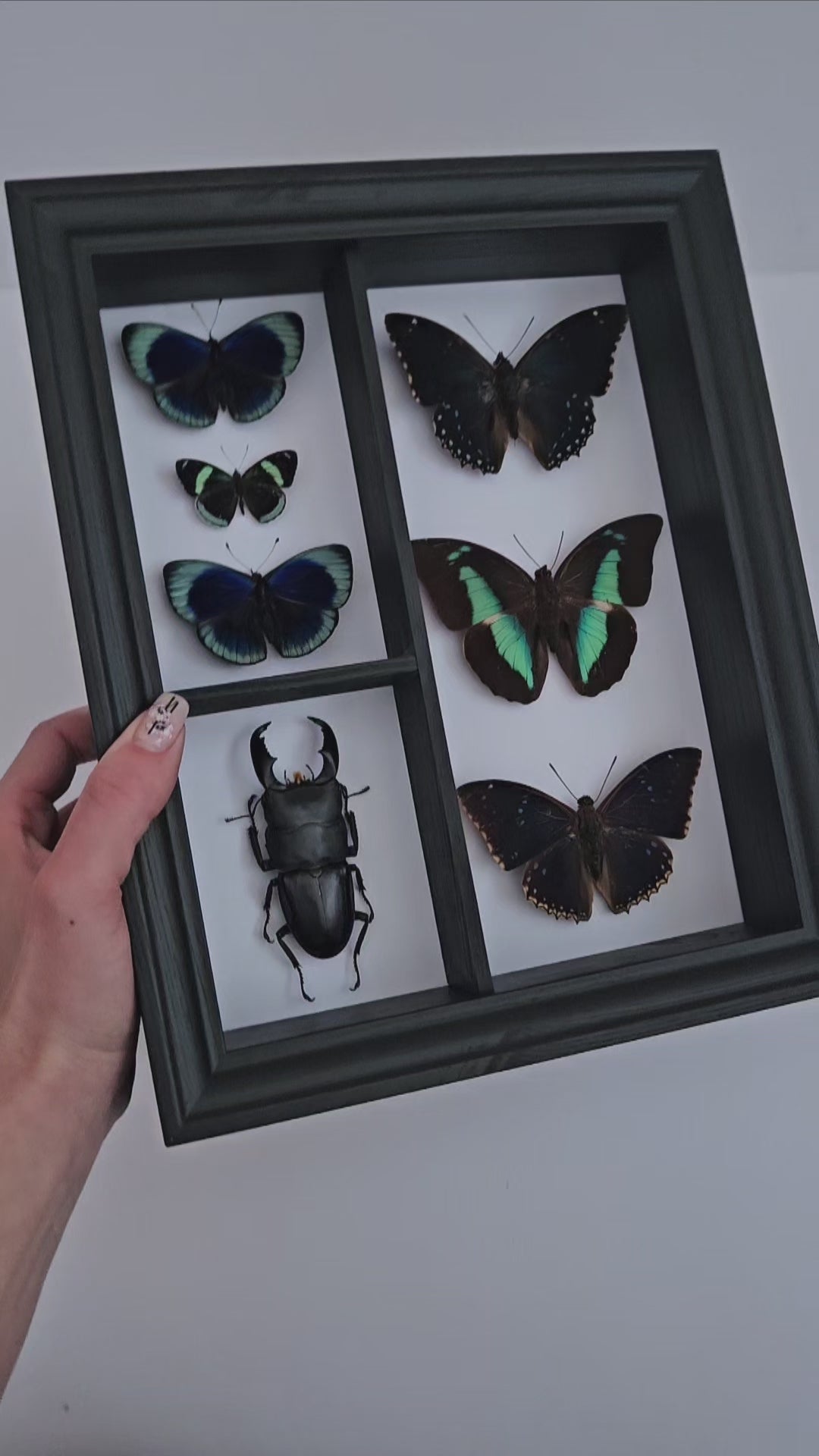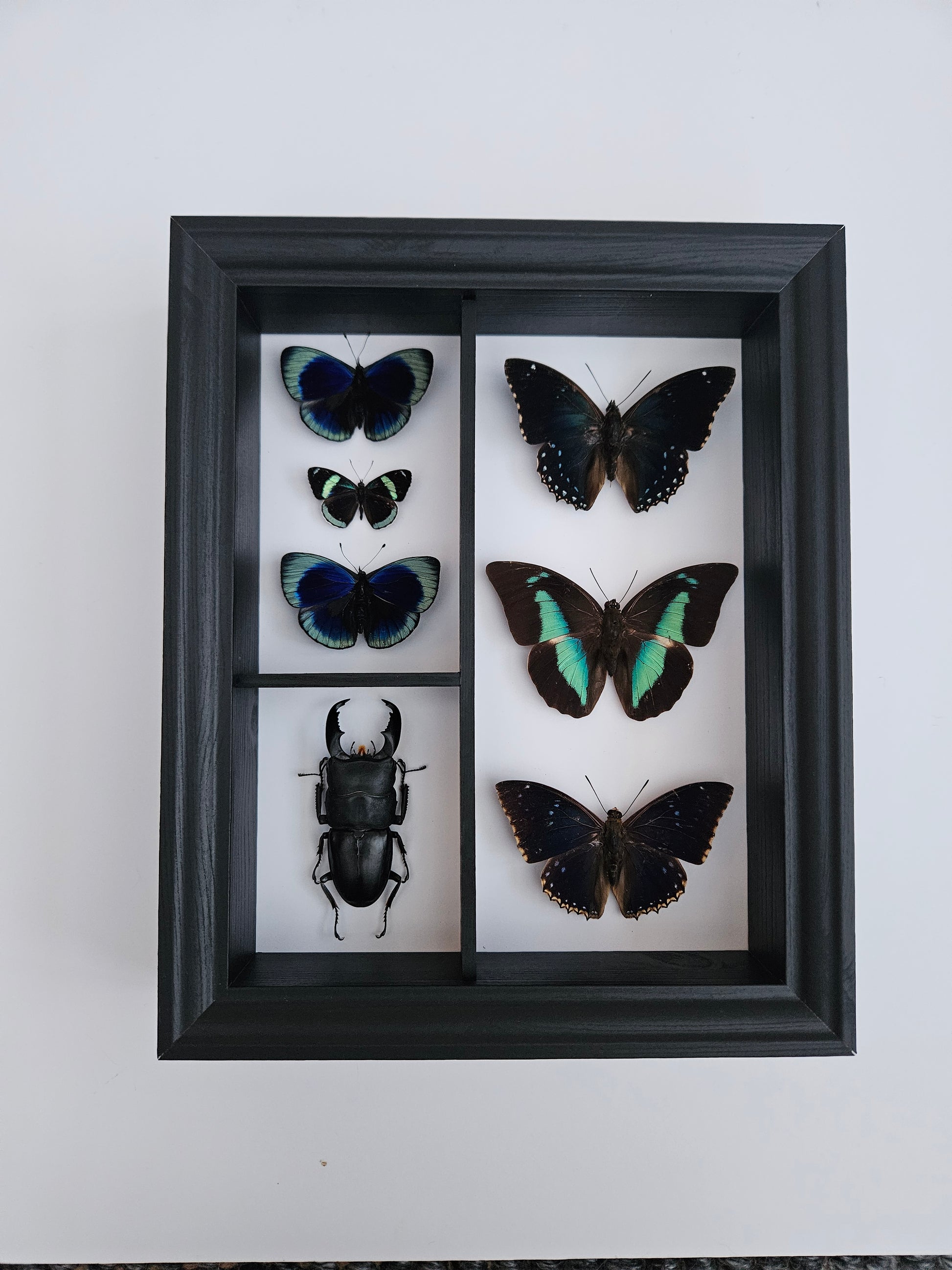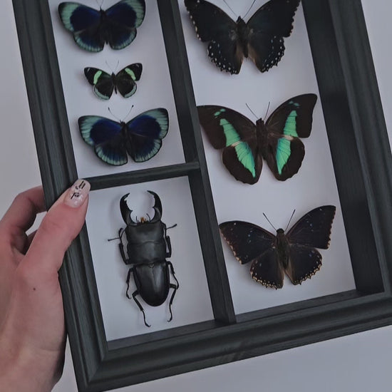 A modern cabinet of curiosities, this framed specimen display brings together iridescent butterflies and a giant stag beetle in a carefully composed box of preserved forms. Set against a white interior, each specimen is presented with clarity and intention, creating a piece that feels both archival and contemporary.
